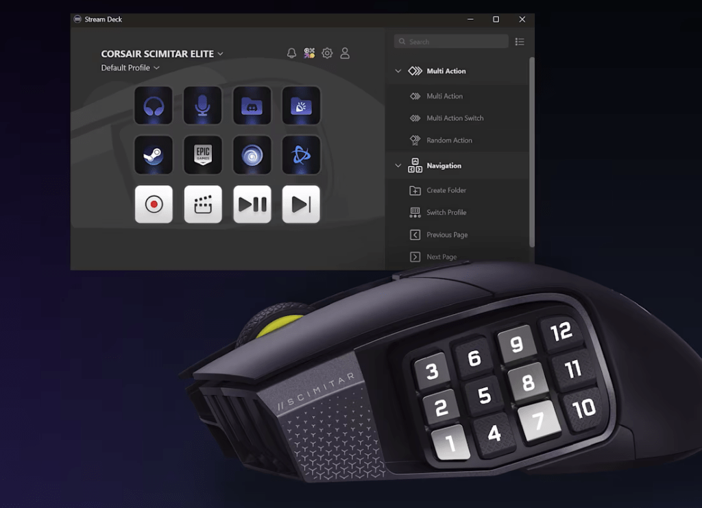 We’ve seen mouses with more than regular quick buttons, mostly used for some additional quick hotkeys in MMO player styles, but the Corsair Scimitar Elite immediatly enables you to set it up for the StreamDecks functionality in their dashboard, granting non-players and mostly streamers a huge benefit.